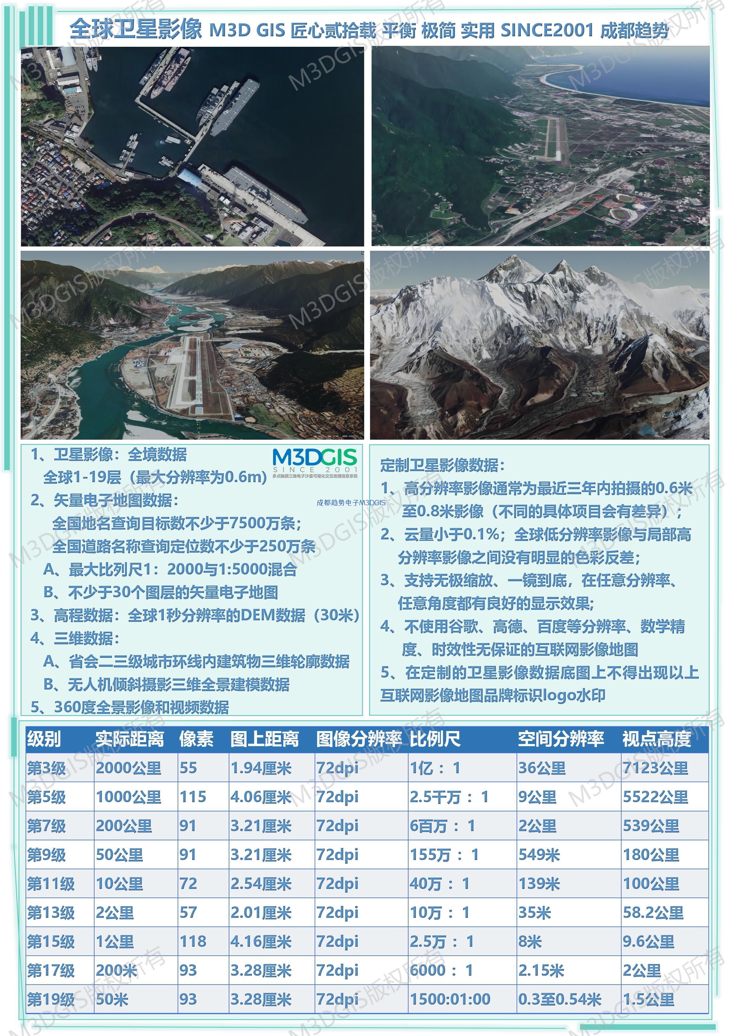 9.多源地理数据可视化引擎(支持在线数据和离线数据显示 ):军民融合电子地图中枢系统:卫星影像数据、多图层矢量地图数据、高程数据、三维模型数据(BIM无人机倾斜摄影数据3DTILES osgb激光点阵云数据360度全景数据GLBgltfWMTSWMSGEOJSONDEM等);支持全球卫星影像最大分辨率0.3米至0.6米和全国最高分辨率为1:2000的矢量地图数据和30米1秒(12.5米)高程数据和部分国家矢量地图数据;三维建筑物轮廓数据为所在省的数据量(轮廓颜色可以按需定制);矢量数据为项目所在省的数据量,以点、线、面的形式融入到卫星影像数据和高程数据中并可以具备一键点击加载呈现;矢量数据图层数量不少于30个,年份必须为2年内(包含省会、组织机构、地级市、县、乡镇、村、火车站、机场、住宿服务、金融保险服务、公司企业、购物服务、体育休闲服务、医疗保健服务、汽车维修、商务住宅、餐饮服务、汽车服务、公共设施、生活服务、科教文化服务、交通设施服务、地名地址信息、政府机构、风景名胜、摩托车服务、汽车销售、通行设施、道路附属设施、事件活动、党政机关、企事业单位、娱乐场所、宗教场所、道路、水系等)