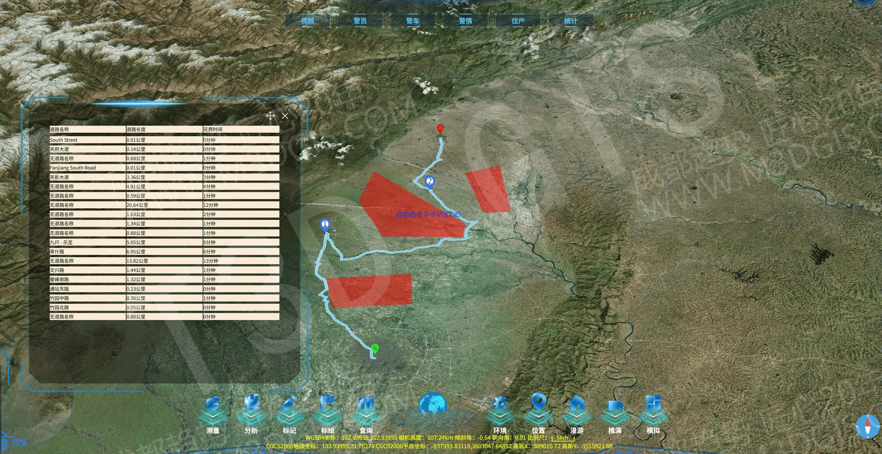 2.3行动路径规划:支持全国离线路径分析,使用先进的路径规划算法对起点、途经点、终点之前的路径进行计算,实现主路径和2条迂回路径的分析、规划,并将计算结果显示在沙盘上,包括道路名称、路线长度、所需时间等信息