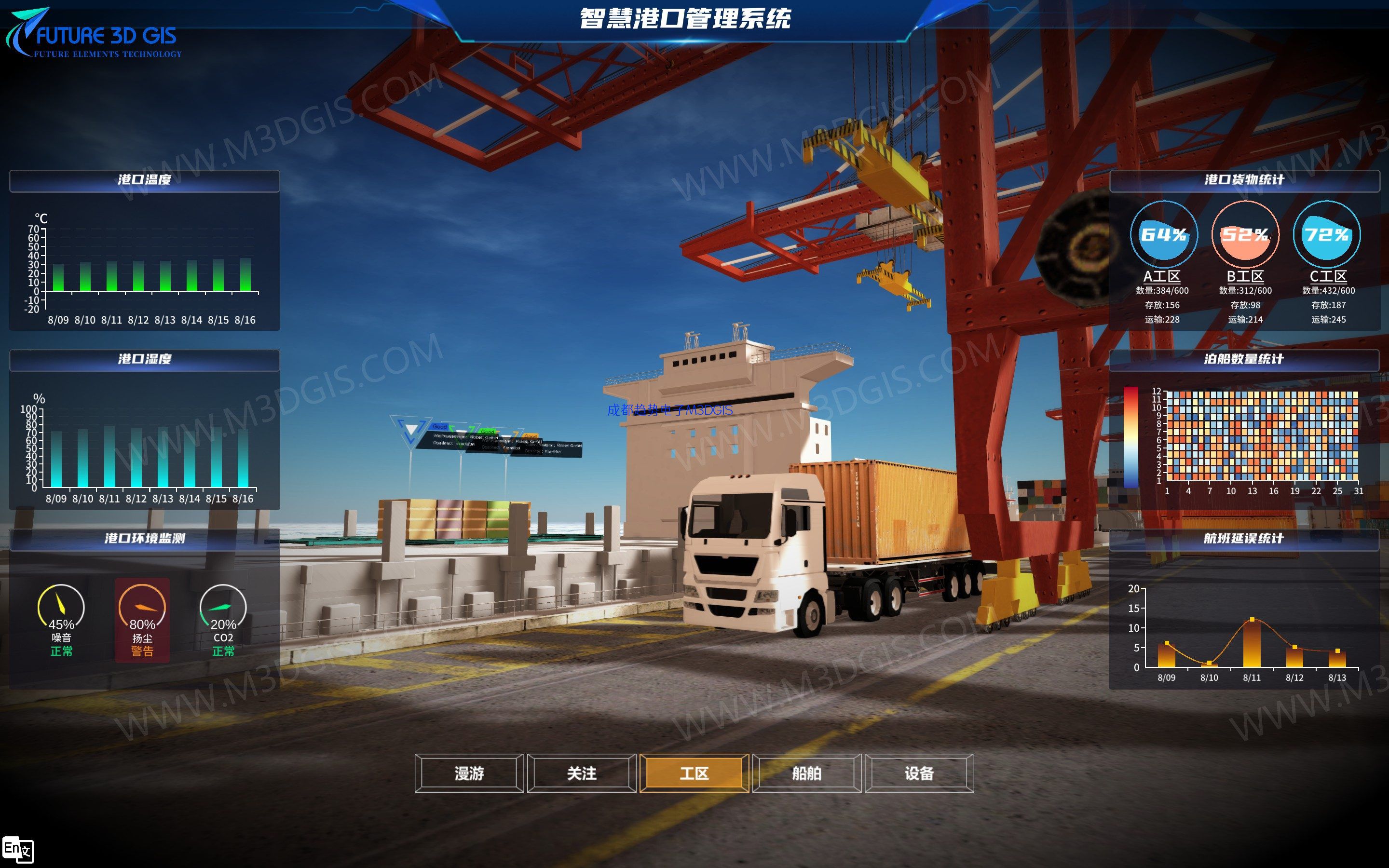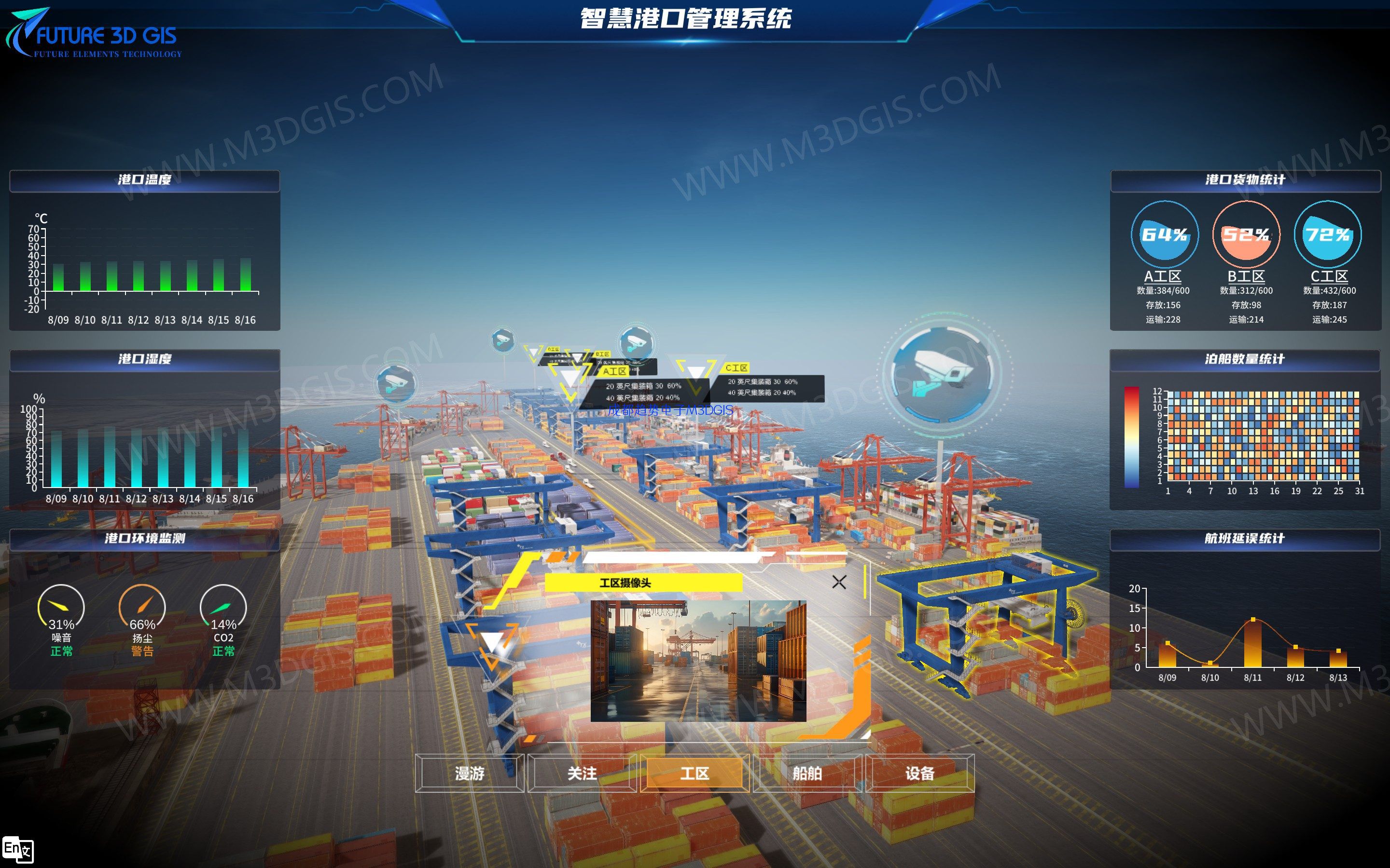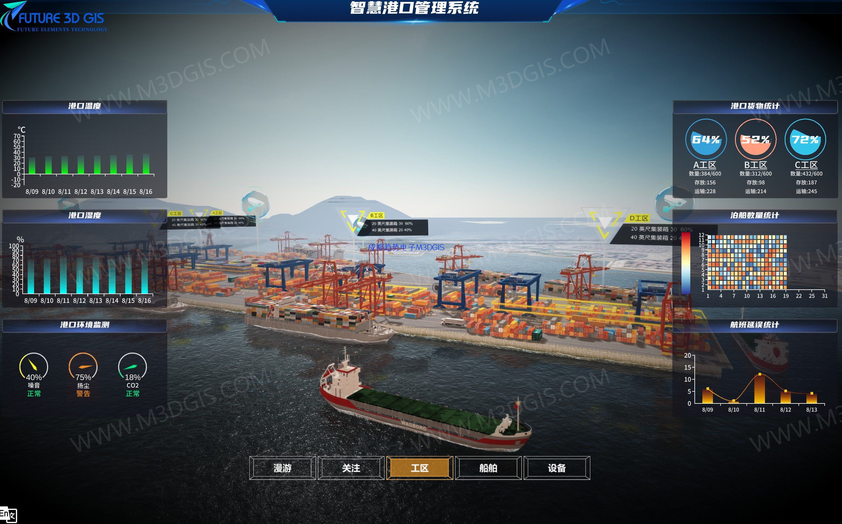 环境监测模块实时捕捉温湿度、噪音、粉尘等关键指标,主动保障合规与作业安全;货物管理功能精准追踪各区域集装箱存量、周转效率与实时流动状态,提升仓储与调度智能化水平;