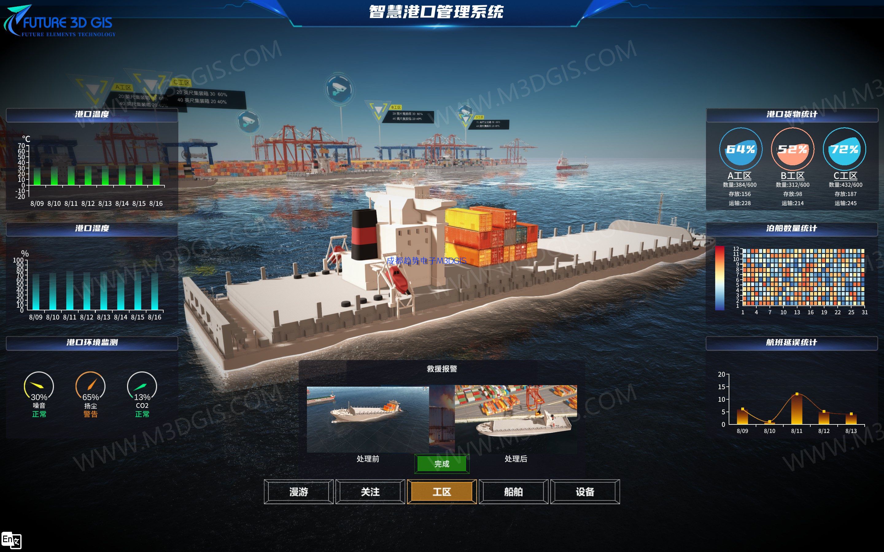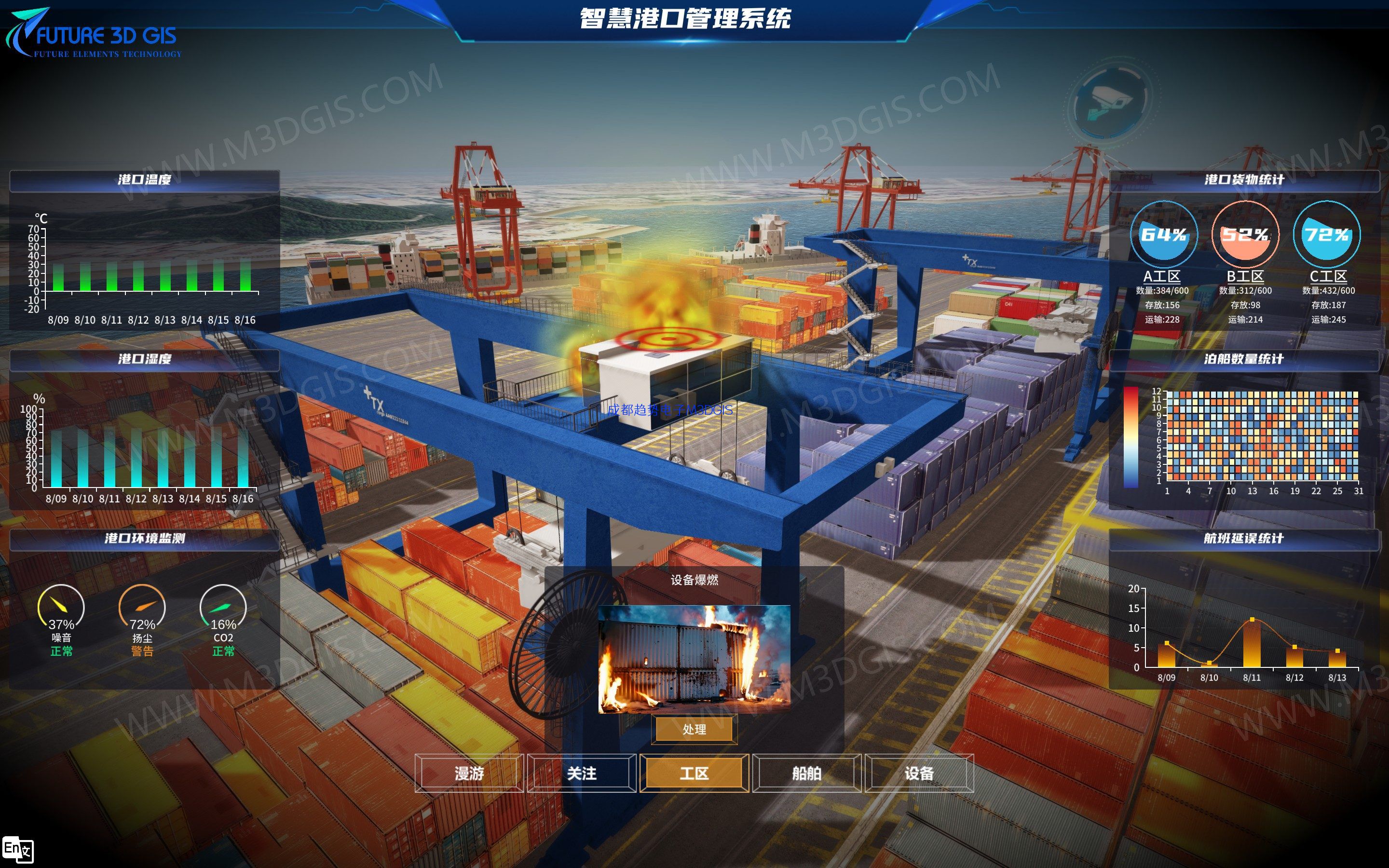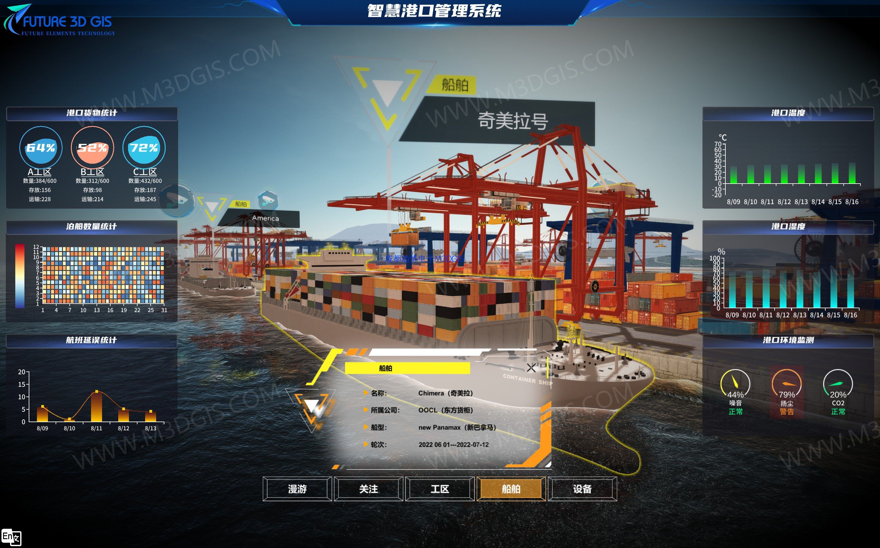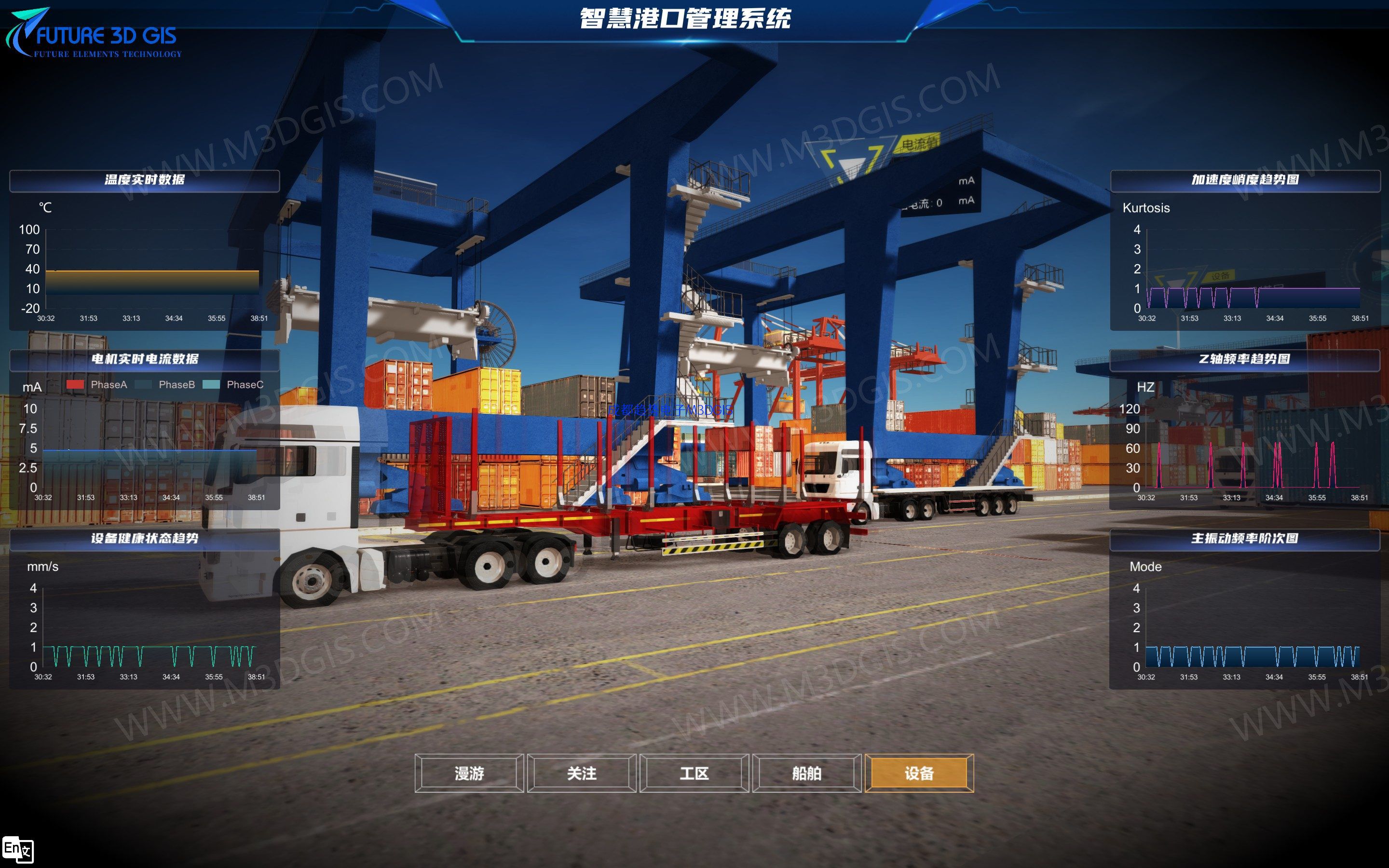 船舶监控模块实时获取船籍、航行计划、靠离泊动态及作业进度,支撑全链路协同决策;设备追踪模块持续监测起重机、集卡等关键设备的运行状态、负载性能与健康指标,实现故障预测与维保前瞻规划。