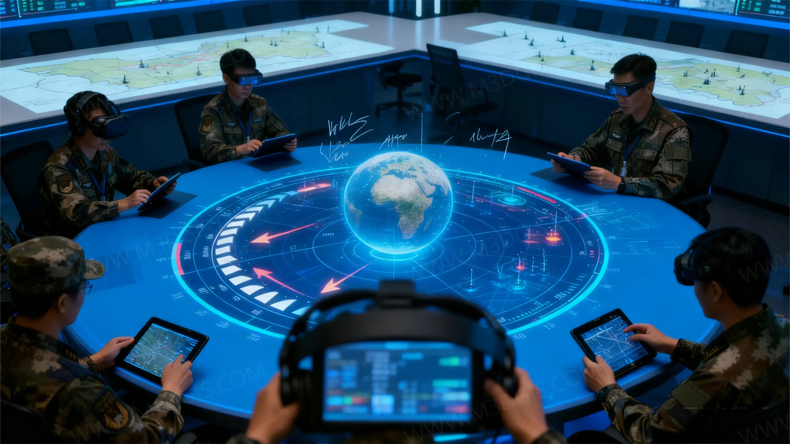 3.协同推演,决胜千里&支持多用户接入同一虚拟战场空间。分布在不同地点的指挥员可以“共处一室”,围绕同一个三维沙盘进行实时协同规划、兵棋推演和方案研讨。每个人的虚拟化身、手势和标注都实时可见,实现真正的去中心化协同指挥