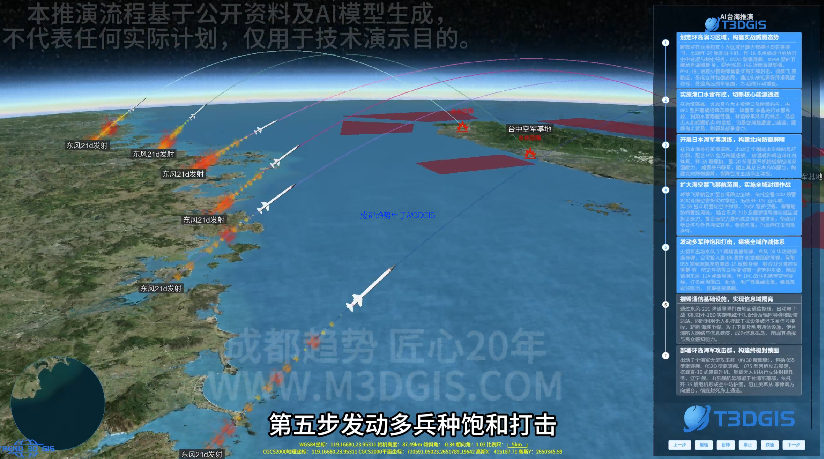 本推演流程基于公开资料及AI模型生成,不代表任何实际计划,仅用于技术演示目的。国产麒麟智能军事标绘推演模拟仿真电子沙盘系统专为联合战役、战术演练和实战化演训任务设计,支持战场态势动态标绘与作战方案智能推演。系统可实现兵力部署、火力配系、机动路线的时序化模拟,包含主战装备动态展示(如战机舰艇战车内部结构透视、武器系统操作流程模拟)和作战行动推演(突击路线、火力覆盖区、封锁控制域);支持实时战场数据接入,可嵌入侦察情报、卫星影像、电子沙盘等实战信息;提供可视化编辑功能,可模拟不同作战预案(如夺控要点、联合火力打击、防御部署调整等),通过时间轴控制推演进程,实现作战行动全流程的三维可视化分析与战术方案优化。