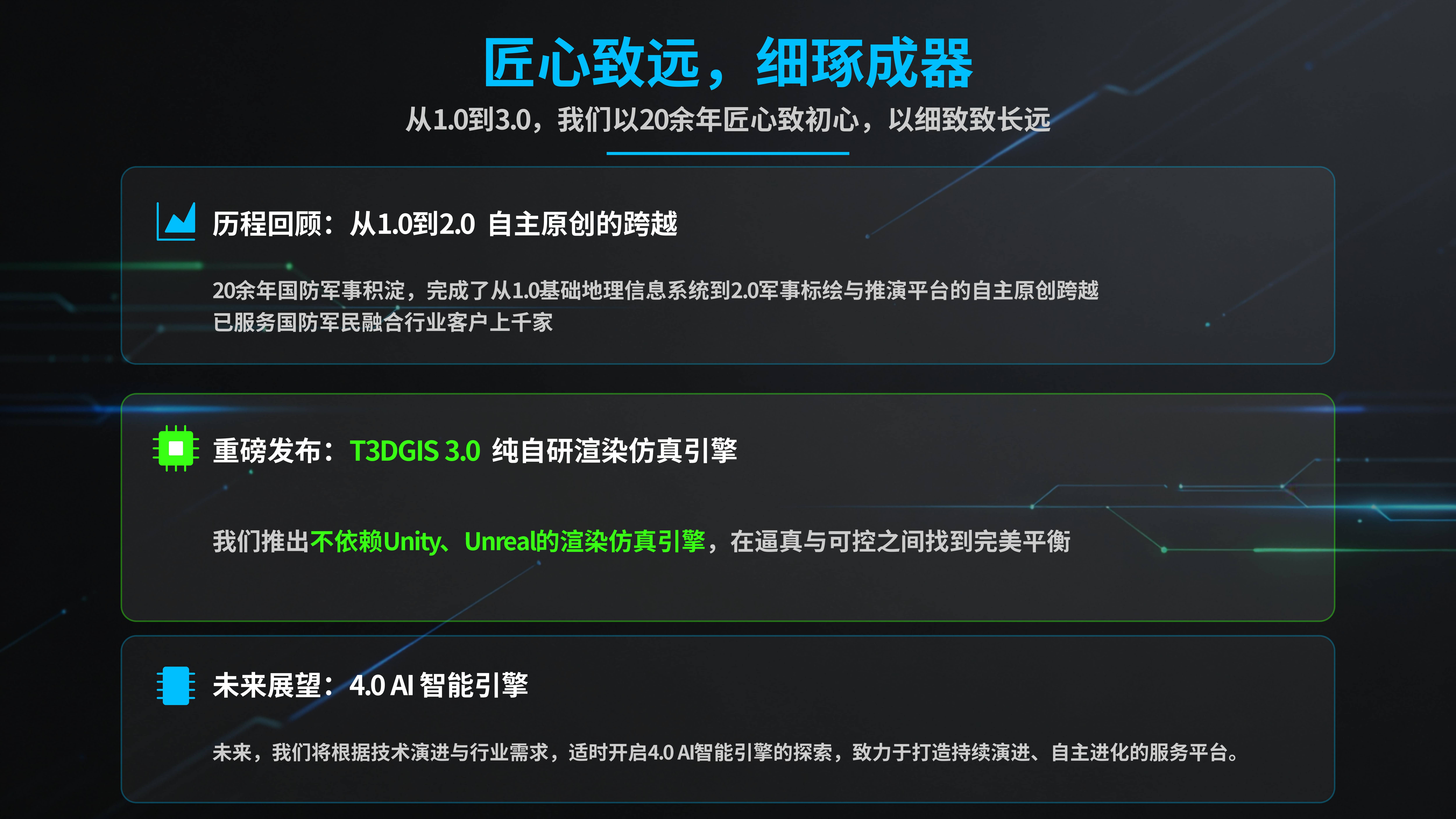 成都趋势电子有限责任公司(https://www.m3dgis.com)自2001年成立至今坚持全自主源代码开发,拒绝开源平台内核,打造T3D GIS 国产银河麒麟二三维数字沙盘大数据可视化研训推演系统!公司深耕国防军事信息化 20 余年,专注军用国产地理信息系统、态势标绘、模拟推演平台研发。上百项军民功能深度耦合赋能・信创模块化按需选配定制。深度适配飞腾 / 龙芯计算机及国产操作系统,立志成为关键领域 “信创人桥”!产品已规模化应用于军委联指、陆海空火箭军及战略支援部队等,覆盖武警、公安、应急、智慧园区、能源安监等多领域场景,在国防军工及民用信创领域累计部署超千套核心系统!获评国家高新技术企业、四川省专精特新企业等,CST、CCMA、CNAS、ILAC MRA 等百余份权威认证。针对武警、部队、公安、消防、应急等行业实战需求,通过手势触摸、鼠标及 VR/MR 交互终端,融合 AI人工智能 与虚拟现实技术,在统一框架内集成全要素三维地理信息(含骨骼动画引擎、全球高清卫星影像集、矢量电子地图库、1 秒级 DEM 高程、高精度无人机倾斜摄影数据及 3DMAX/BIM 轻量化构件库等),为指挥决策提供应急场景构建、战场态势解算、作战决心生成的全流程支撑,实现实战化便携部署与实时响应,达成实案推演、实战应用的训练目标。始终践行 “凡事有闭环、件件可追溯、事事见成效” 的服务标准。