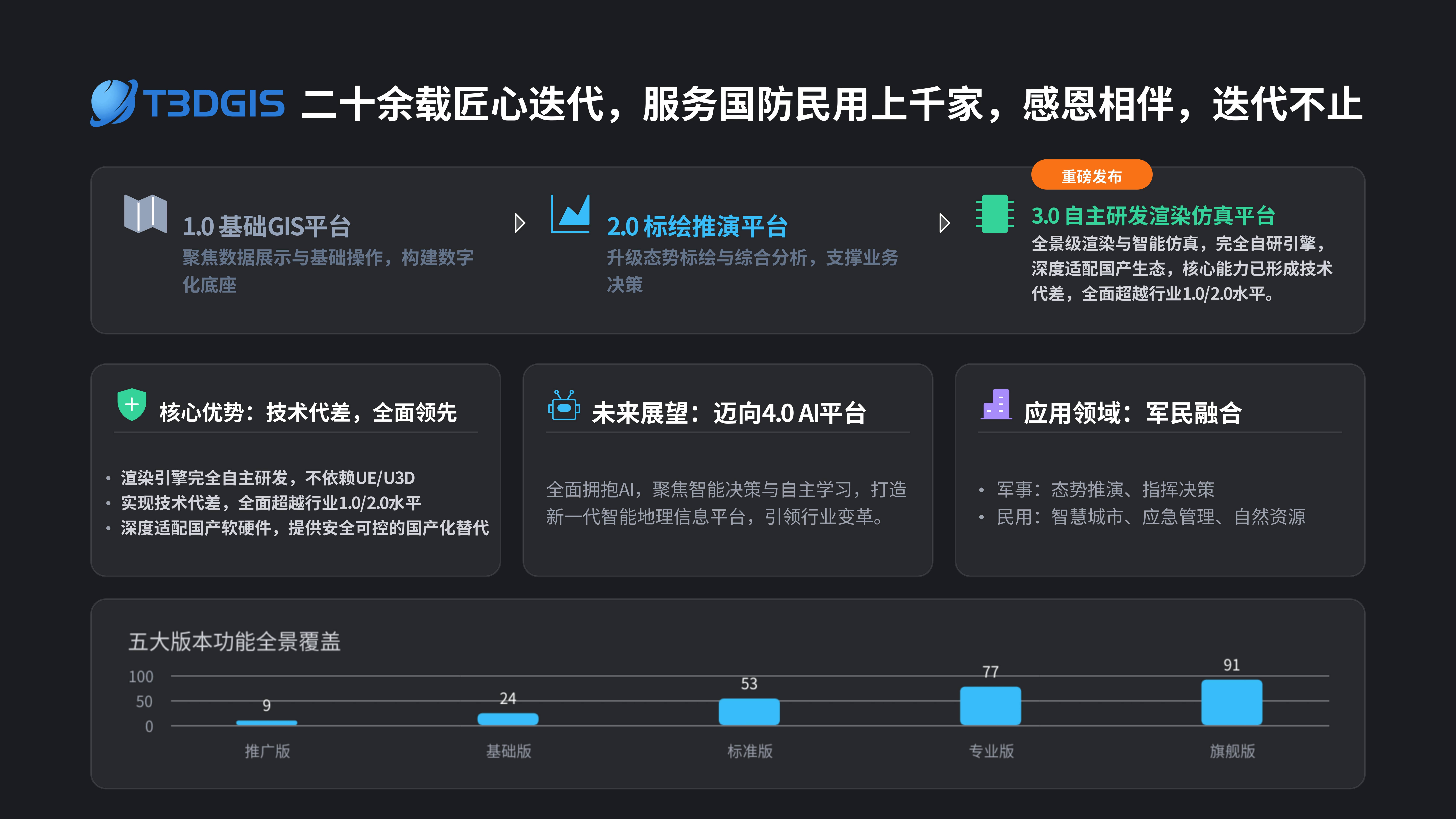 T3D GIS&M3D GIS国产三维电子沙盘绝不使用任何国内外免费或收费开源地理信息系统平台,我们没有“美式装备”(真正的国产源代码级软件开发),但是在您最需要的时候,我们一定是金刚川上的那座“人桥”!我司服务国防信息化装备建设20多年,专注于军用国产地理信息系统、态势标绘、模拟推演平台和应用系统研发,参与国防项目建设并部署各类产品数千套(若需了解核心功能,请点击查看本页视频)